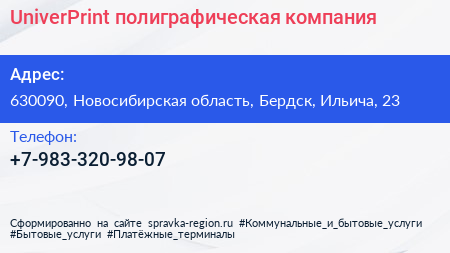 UniverPrint, полиграфическая компания по адресу 630090, Новосибирская область, Бердск, Ильича, 23 в дальнейшем Организация, размещена в следующих категориях: