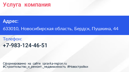 Услуга+, компания по адресу 633010, Новосибирская область, Бердск, Пушкина, 44 в дальнейшем Организация, размещена в следующих категориях: