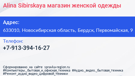 Alina Sibirskaya, магазин женской одежды по адресу 633010, Новосибирская область, Бердск, Первомайская, 9 в дальнейшем Организация, размещена в следующих категориях: