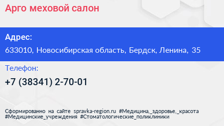 Арго, меховой салон по адресу 633010, Новосибирская область, Бердск, Ленина, 35 в дальнейшем Организация, размещена в следующих категориях: