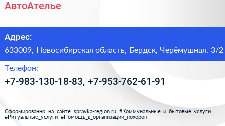 АвтоАтелье по адресу 633009, Новосибирская область, Бердск, Черёмушная, 3/2 в дальнейшем Организация, размещена в следующих категориях: