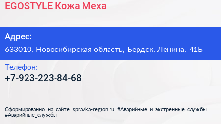 EGOSTYLE Кожа & Меха по адресу 633010, Новосибирская область, Бердск, Ленина, 41Б в дальнейшем Организация, размещена в следующих категориях: