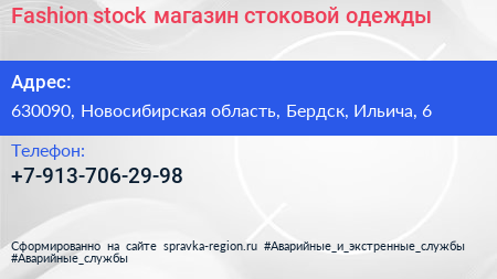 Fashion stock, магазин стоковой одежды по адресу 630090, Новосибирская область, Бердск, Ильича, 6 в дальнейшем Организация, размещена в следующих категориях: