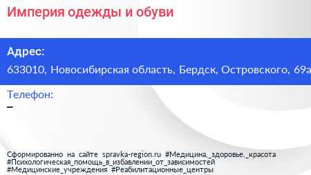 Империя одежды и обуви по адресу 633010, Новосибирская область, Бердск, Островского, 69а в дальнейшем Организация, размещена в следующих категориях: