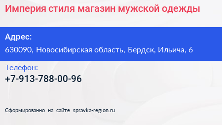Империя стиля, магазин мужской одежды по адресу 630090, Новосибирская область, Бердск, Ильича, 6 в дальнейшем Организация, размещена в следующих категориях: