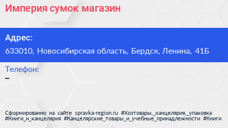Империя сумок, магазин по адресу 633010, Новосибирская область, Бердск, Ленина, 41Б в дальнейшем Организация, размещена в следующих категориях: