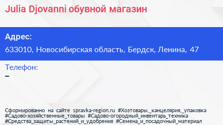 Julia Djovanni, обувной магазин по адресу 633010, Новосибирская область, Бердск, Ленина, 47 в дальнейшем Организация, размещена в следующих категориях: