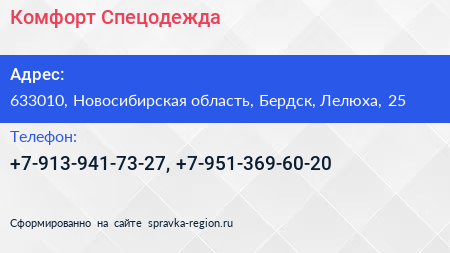 Комфорт-Спецодежда по адресу 633010, Новосибирская область, Бердск, Лелюха, 25 в дальнейшем Организация, размещена в следующих категориях:
