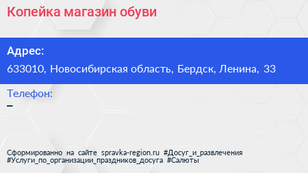 Копейка, магазин обуви по адресу 633010, Новосибирская область, Бердск, Ленина, 33 в дальнейшем Организация, размещена в следующих категориях: