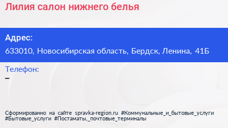 Лилия, салон нижнего белья по адресу 633010, Новосибирская область, Бердск, Ленина, 41Б в дальнейшем Организация, размещена в следующих категориях: