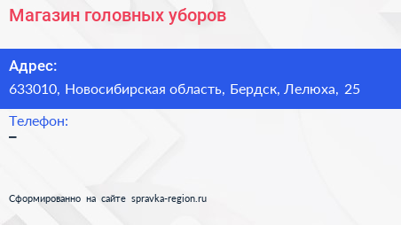 Магазин головных уборов по адресу 633010, Новосибирская область, Бердск, Лелюха, 25 в дальнейшем Организация, размещена в следующих категориях: