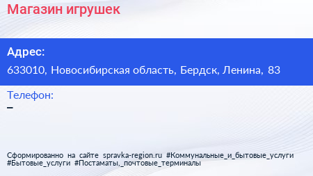 Магазин игрушек по адресу 633010, Новосибирская область, Бердск, Ленина, 83 в дальнейшем Организация, размещена в следующих категориях: