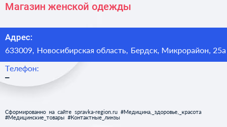 Магазин женской одежды по адресу 633009, Новосибирская область, Бердск, Микрорайон, 25а в дальнейшем Организация, размещена в следующих категориях:
