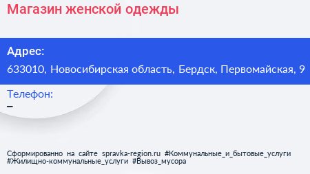 Магазин женской одежды по адресу 633010, Новосибирская область, Бердск, Первомайская, 9 в дальнейшем Организация, размещена в следующих категориях: