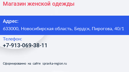 Магазин женской одежды по адресу 633000, Новосибирская область, Бердск, Пирогова, 40/1 в дальнейшем Организация, размещена в следующих категориях: