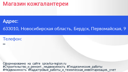Магазин кожгалантереи по адресу 633010, Новосибирская область, Бердск, Первомайская, 9 в дальнейшем Организация, размещена в следующих категориях: