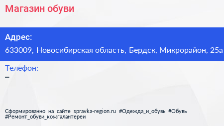 Магазин обуви по адресу 633009, Новосибирская область, Бердск, Микрорайон, 25а в дальнейшем Организация, размещена в следующих категориях: