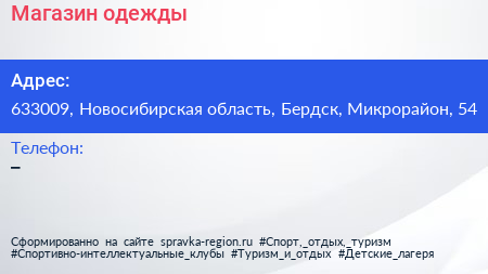 Магазин одежды по адресу 633009, Новосибирская область, Бердск, Микрорайон, 54 в дальнейшем Организация, размещена в следующих категориях: