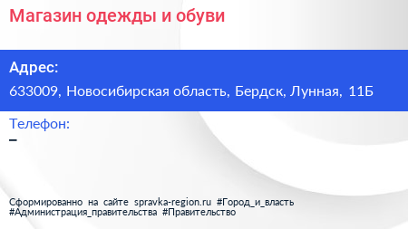 Магазин одежды и обуви по адресу 633009, Новосибирская область, Бердск, Лунная, 11Б в дальнейшем Организация, размещена в следующих категориях:
