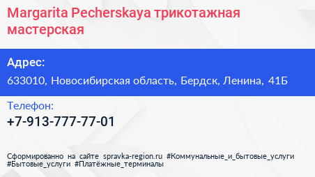 Margarita Pecherskaya, трикотажная мастерская по адресу 633010, Новосибирская область, Бердск, Ленина, 41Б в дальнейшем Организация, размещена в следующих категориях: