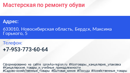 Мастерская по ремонту обуви по адресу 633010, Новосибирская область, Бердск, Максима Горького, 5 в дальнейшем Организация, размещена в следующих категориях: