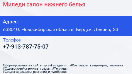 Миледи, салон нижнего белья по адресу 633010, Новосибирская область, Бердск, Ленина, 33 в дальнейшем Организация, размещена в следующих категориях: