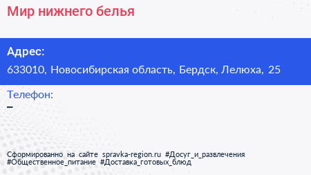 Мир нижнего белья по адресу 633010, Новосибирская область, Бердск, Лелюха, 25 в дальнейшем Организация, размещена в следующих категориях: