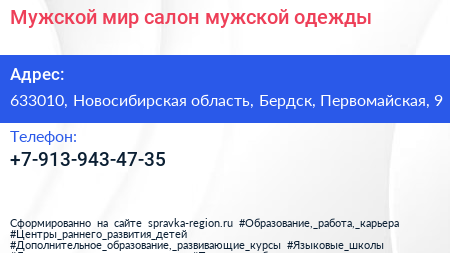 Мужской мир, салон мужской одежды по адресу 633010, Новосибирская область, Бердск, Первомайская, 9 в дальнейшем Организация, размещена в следующих категориях: