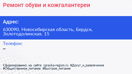 Ремонт обуви и кожгалантереи по адресу 630090, Новосибирская область, Бердск, Золотодолинская, 15 в дальнейшем Организация, размещена в следующих категориях: