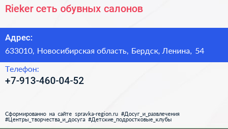 Rieker, сеть обувных салонов по адресу 633010, Новосибирская область, Бердск, Ленина, 54 в дальнейшем Организация, размещена в следующих категориях: