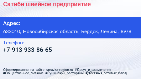 Сатиби, швейное предприятие по адресу 633010, Новосибирская область, Бердск, Ленина, 89/8 в дальнейшем Организация, размещена в следующих категориях: