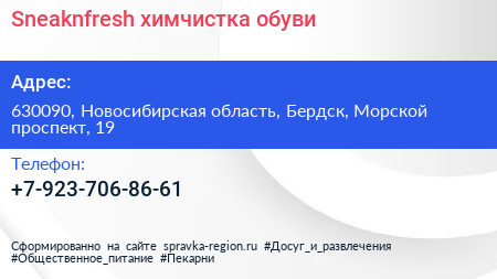 Sneaknfresh, химчистка обуви по адресу 630090, Новосибирская область, Бердск, Морской проспект, 19 в дальнейшем Организация, размещена в следующих категориях: