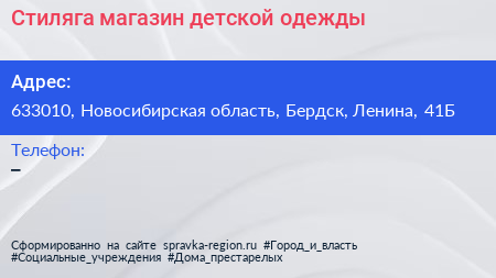 Стиляга, магазин детской одежды по адресу 633010, Новосибирская область, Бердск, Ленина, 41Б в дальнейшем Организация, размещена в следующих категориях: