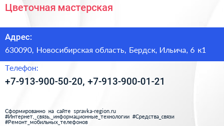 Цветочная мастерская по адресу 630090, Новосибирская область, Бердск, Ильича, 6 к1 в дальнейшем Организация, размещена в следующих категориях: