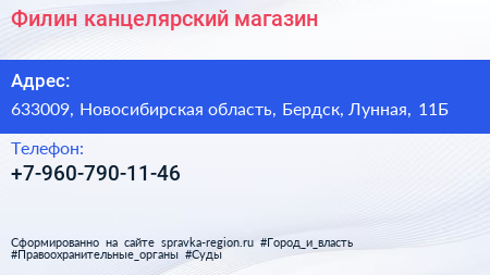 Филин, канцелярский магазин по адресу 633009, Новосибирская область, Бердск, Лунная, 11Б в дальнейшем Организация, размещена в следующих категориях: