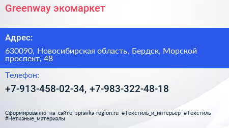 Greenway, экомаркет по адресу 630090, Новосибирская область, Бердск, Морской проспект, 48 в дальнейшем Организация, размещена в следующих категориях: