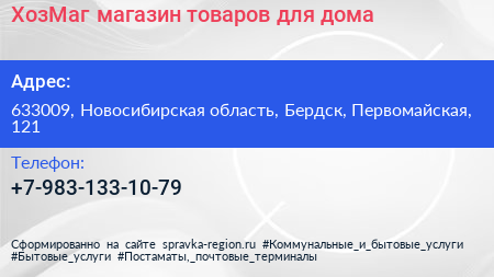 ХозМаг, магазин товаров для дома по адресу 633009, Новосибирская область, Бердск, Первомайская, 121 в дальнейшем Организация, размещена в следующих категориях: