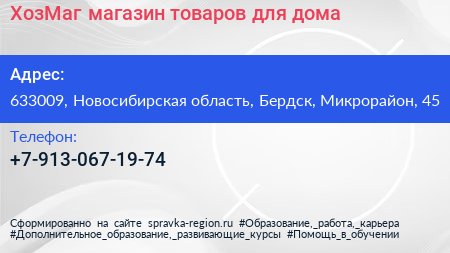 ХозМаг, магазин товаров для дома по адресу 633009, Новосибирская область, Бердск, Микрорайон, 45 в дальнейшем Организация, размещена в следующих категориях: