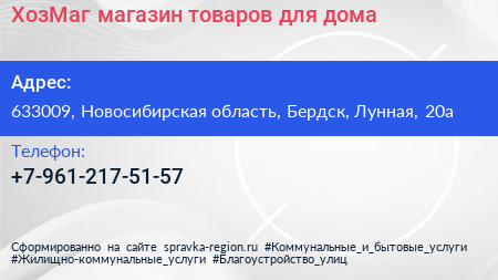 ХозМаг, магазин товаров для дома по адресу 633009, Новосибирская область, Бердск, Лунная, 20а в дальнейшем Организация, размещена в следующих категориях: