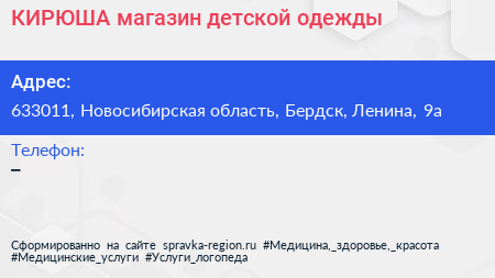 КИРЮША, магазин детской одежды по адресу 633011, Новосибирская область, Бердск, Ленина, 9а в дальнейшем Организация, размещена в следующих категориях: