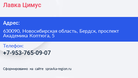 Лавка Цимус по адресу 630090, Новосибирская область, Бердск, проспект Академика Коптюга, 5 в дальнейшем Организация, размещена в следующих категориях: