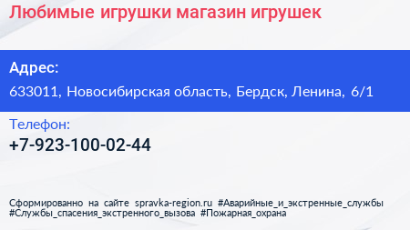Любимые игрушки, магазин игрушек по адресу 633011, Новосибирская область, Бердск, Ленина, 6/1 в дальнейшем Организация, размещена в следующих категориях: