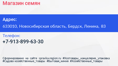 Магазин семян по адресу 633010, Новосибирская область, Бердск, Ленина, 83 в дальнейшем Организация, размещена в следующих категориях: