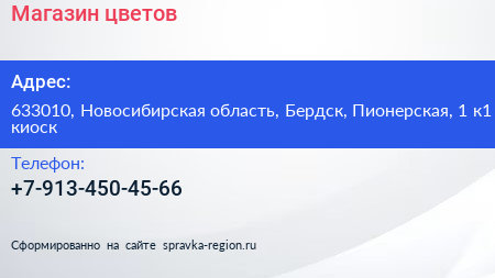 Магазин цветов по адресу 633010, Новосибирская область, Бердск, Пионерская, 1 к1 киоск в дальнейшем Организация, размещена в следующих категориях: