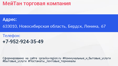 МейТан, торговая компания по адресу 633010, Новосибирская область, Бердск, Ленина, 67 в дальнейшем Организация, размещена в следующих категориях: