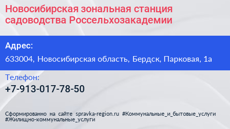Новосибирская зональная станция садоводства Россельхозакадемии по адресу 633004, Новосибирская область, Бердск, Парковая, 1а в дальнейшем Организация, размещена в следующих категориях: