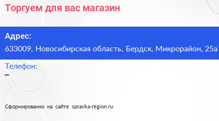 Торгуем для вас, магазин по адресу 633009, Новосибирская область, Бердск, Микрорайон, 25а в дальнейшем Организация, размещена в следующих категориях: