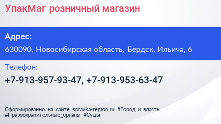 УпакМаг, розничный магазин по адресу 630090, Новосибирская область, Бердск, Ильича, 6 в дальнейшем Организация, размещена в следующих категориях: