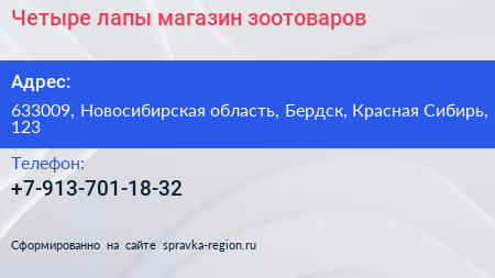 Четыре лапы, магазин зоотоваров по адресу 633009, Новосибирская область, Бердск, Красная Сибирь, 123 в дальнейшем Организация, размещена в следующих категориях: