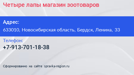 Четыре лапы, магазин зоотоваров по адресу 633010, Новосибирская область, Бердск, Ленина, 33 в дальнейшем Организация, размещена в следующих категориях:
